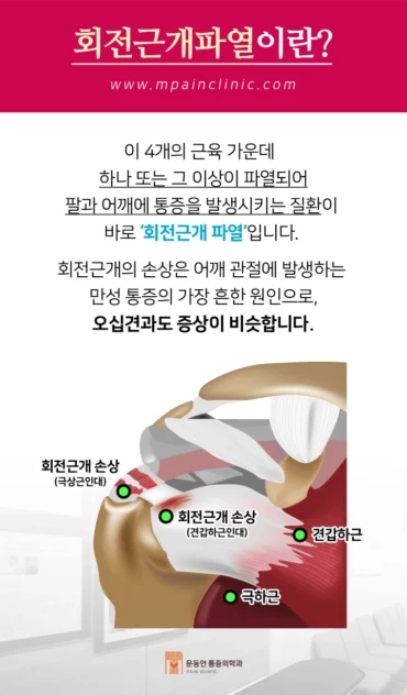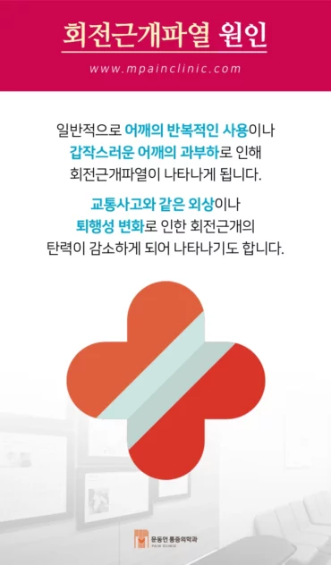 - 어깨 외상(무거운 물건을 들거나 심하게 어깨를 부딪치거나 팔이 과하게 젖혀질 때) 후 아주 심한 통증이 있고 움직이기 힘들다.