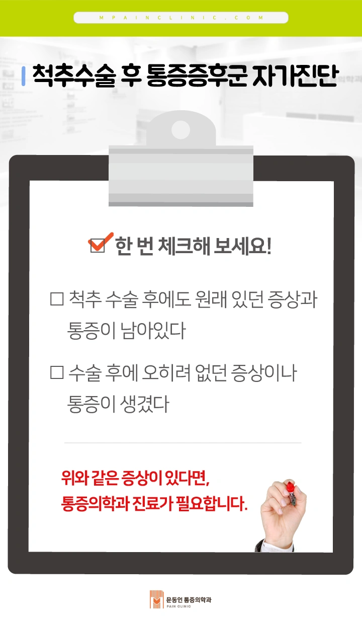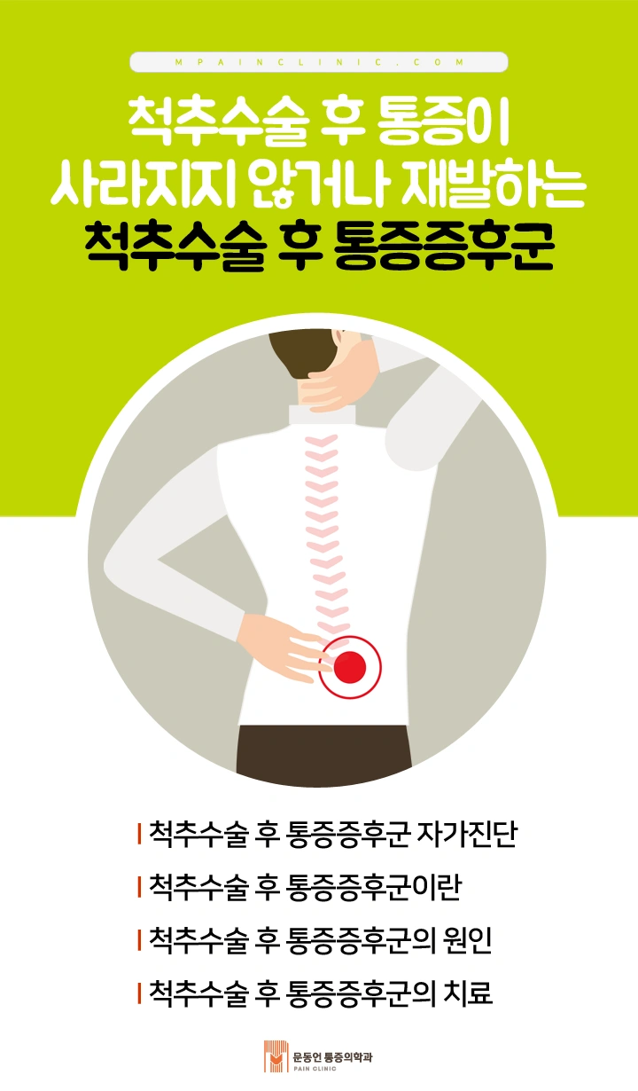 척추수술 후 통증증후군의 발생 빈도는 발생 빈도는 10~40%로 매우 높은 것으로 알려져 있습니다.