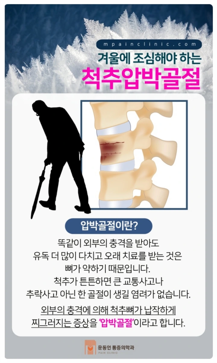 상체의 무게를 지지하는 척추가 골밀도가 떨어지며 뼈의 지지조직이 엉성해져서 뼈가 부러지거나 점점 주저앉아 압박골절이 될 수 있습니다.