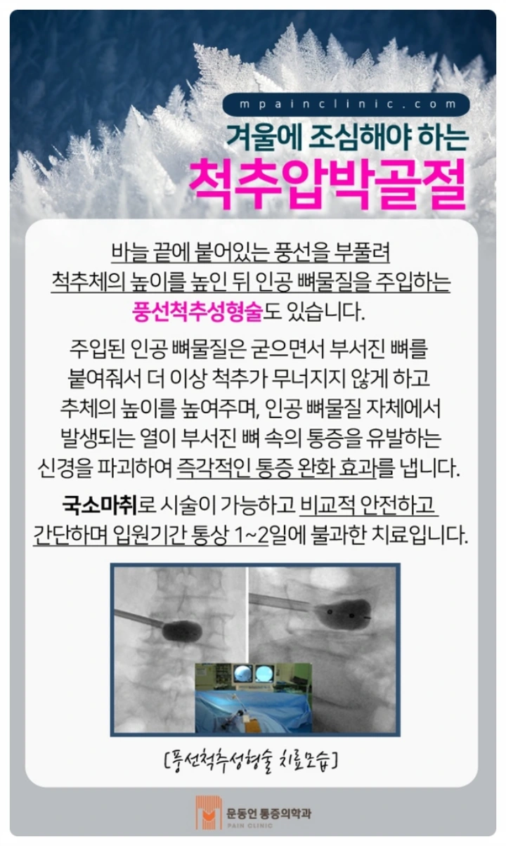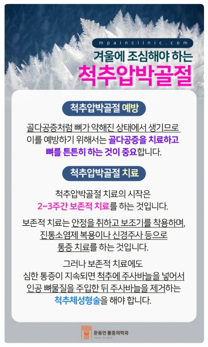 - 스테로이드 복용 : 스테로이드제, 항암제, 항경련제와 같은 약물은 골다공증을 일으킬 수 있기 때문에 척추압박골절에도 영향을 미칠 수 있습니다